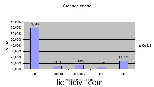 1 granada centroDe este video tenemos que un 69,61% se desplaza a pie, un 14,36% en moto, un 7,18 % en coche, un 4,97% en bicicleta y un 3,87% en bus.