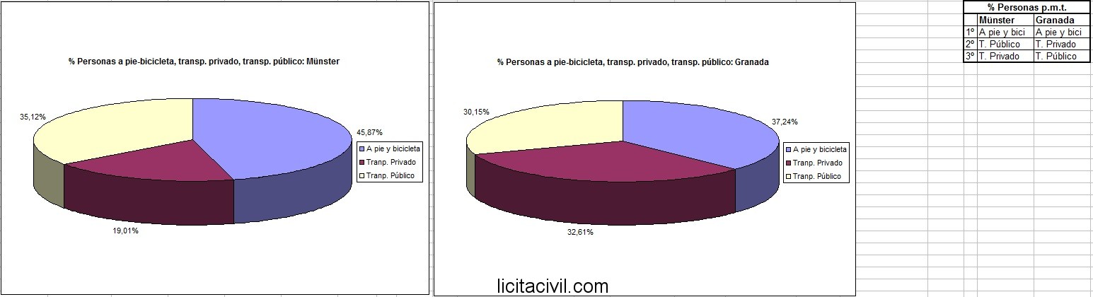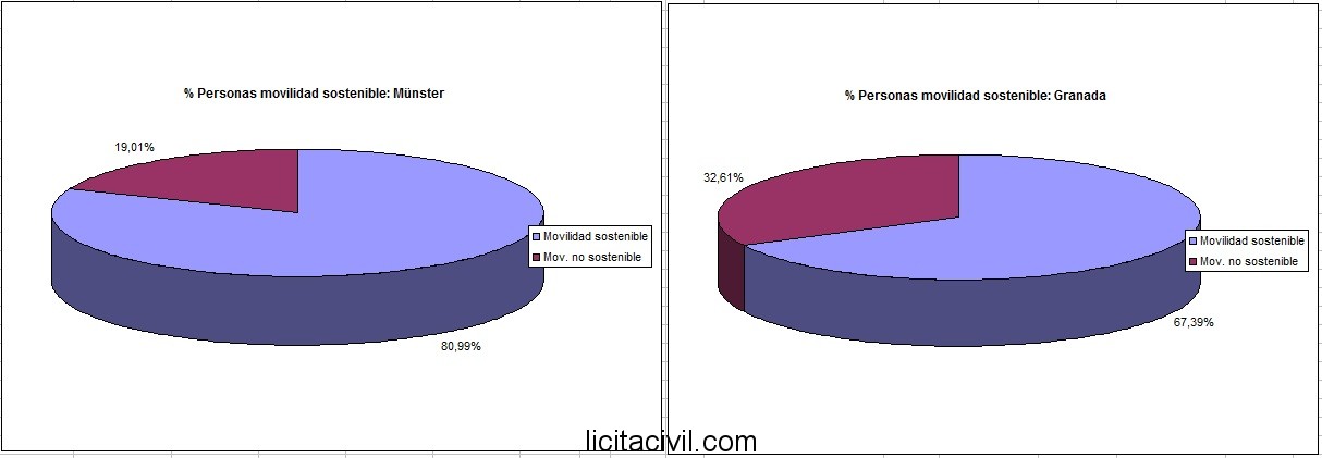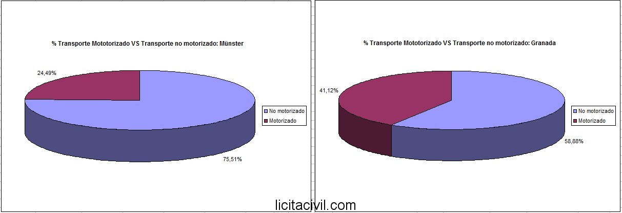 Comparativamente, los porcentajes respecto al desplazamiento motorizado y no motorizado, son bastante diferentes, ya que en Münster el no motorizado ocupa algo más de 2/3, mientras que en Granada algo más que 1/2.