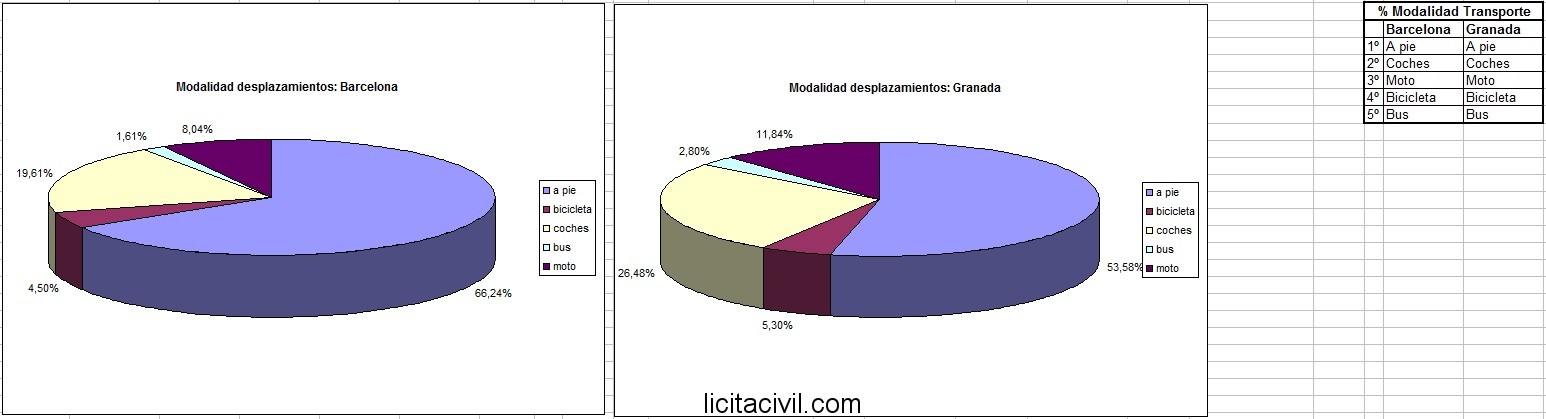 Donde se tiene que en Granada hay menor porcentaje de desplazamientos a pie, mayor en coche y en moto. Así, de esta gráfica se tiene el siguiente resultado y por orden: en Barcelona a pie, coches, bus, moto y bicicleta, en Granada idéntico nada más que bus ocupa segundo lugar y coches tercer lugar.