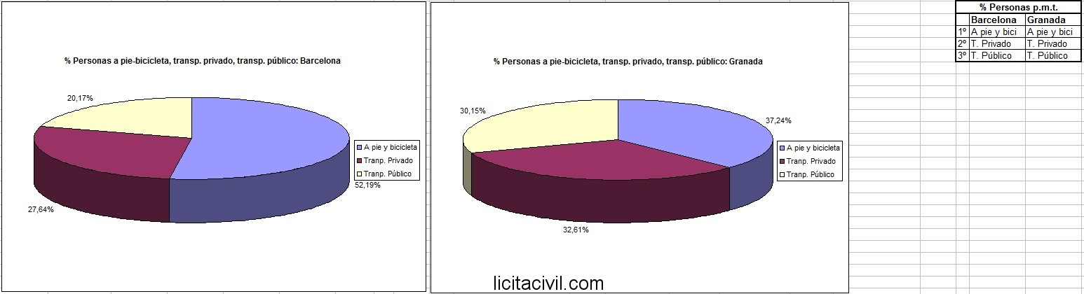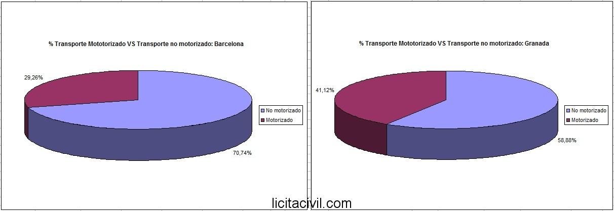 Comparativamente, los porcentajes respecto al desplazamiento motorizado y no motorizado, son bastante diferentes, ya que en Barcelona el no motorizado ocupa algo menos de 2/3, mientras que en Granada algo más que 1/2.