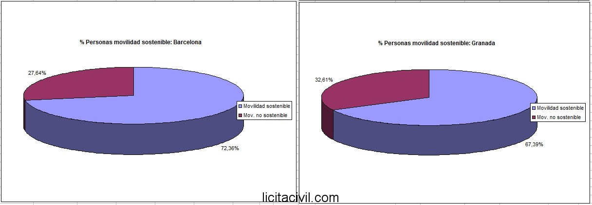 Así tenemos que el porcentaje de personas que realizan una movilidad más sostenible es similar en Barcelona y Granada (72,36% frente 67,39%). Siendo el dato granadino más elevado de lo esperado por el gran porcentaje de desplazamientos en bus urbano (30,15%) como hemos comentado anteriormente.