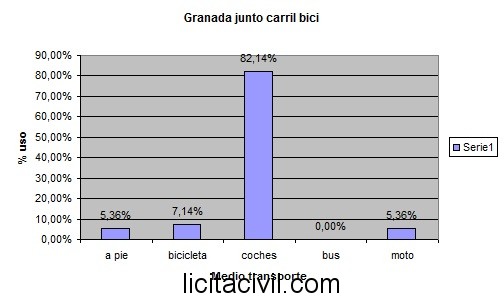 3 granada junto a carril biciDe este video tenemos que un 82,14% se desplaza en coche, un 7,14% en bicicleta, un 5,36 % en moto y un 5,36 % a pie.