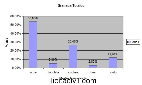 4 granada totalesDe dichos totales tenemos que un 67,39% de la población utilizan medios no motorizados, mientras que un 32,61% si los utiliza. Aproximadamente algo más de 1/3 de la población opta por viajes a pie o en bicicleta.