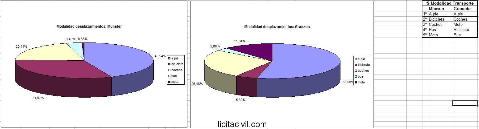 Mientras que en Münster los mayores porcentajes de movilidad corresponden a pie y en bicicleta, en Granada son a pie y en coche. Estando en 4º lugar la bicicleta en Granada, frente al 2º lugar en Münster.
