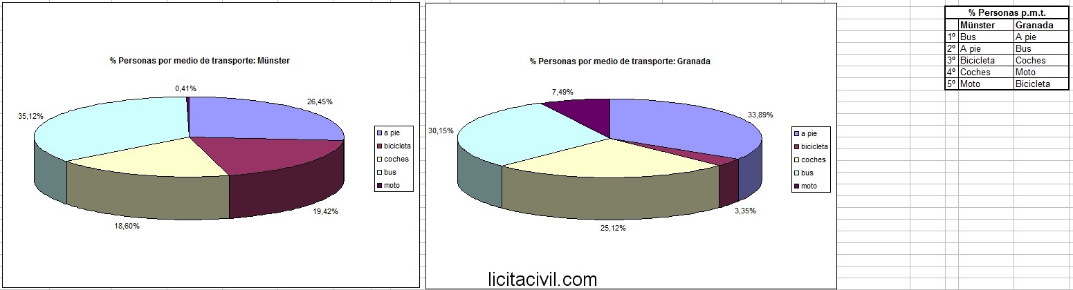 Donde se tiene que en Granada hay mayor porcentaje de desplazamientos a pie, en coche y en moto (donde es la mayor diferencia con Münster 0,41% a 7,49% en Granada). Así, de esta gráfica se tiene el siguiente resultado (podríamos llamarlo «inverso») y por orden: en Münster Bus y a pie, en Granada a pie y en Bus, seguidos ambos de Bicicleta, coches y moto (M) y Coches, moto y bicicleta (G).