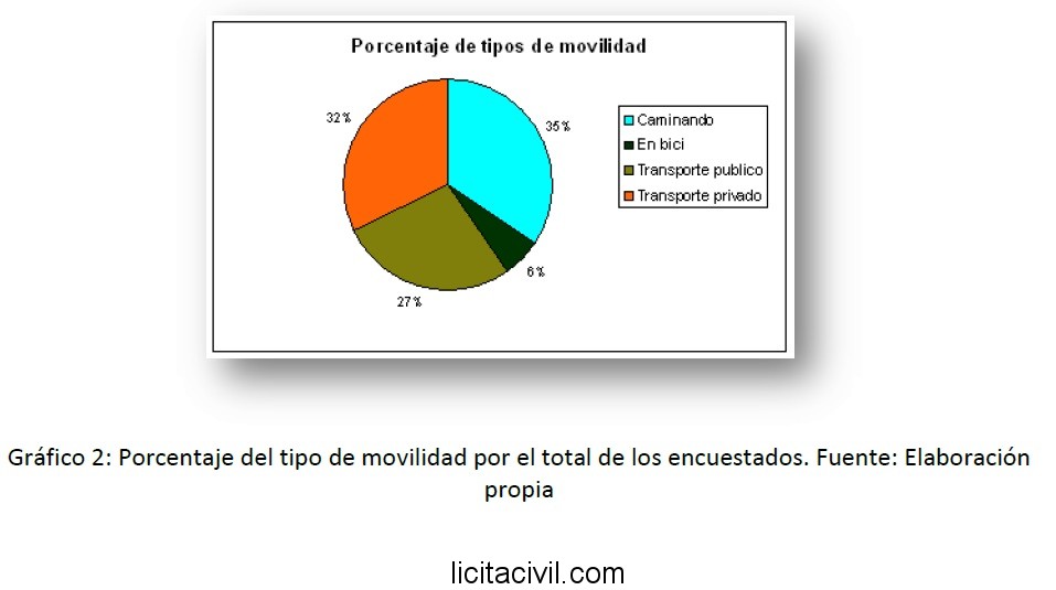 Un 33,89% se desplaza a pie, un 3,35% en bicicleta, un 25,12% en coche, 30,15% en bus y un 7,49% en moto. Estimando que en cada coche vaya 1,5 personas y en cada bus 17.
