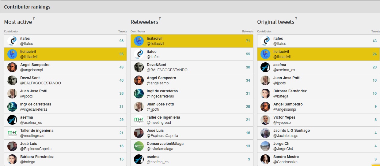 Licitacivil fue segunda como cuenta más activa, primera con mayor número de retweets y segunda con mayor número de tweets.